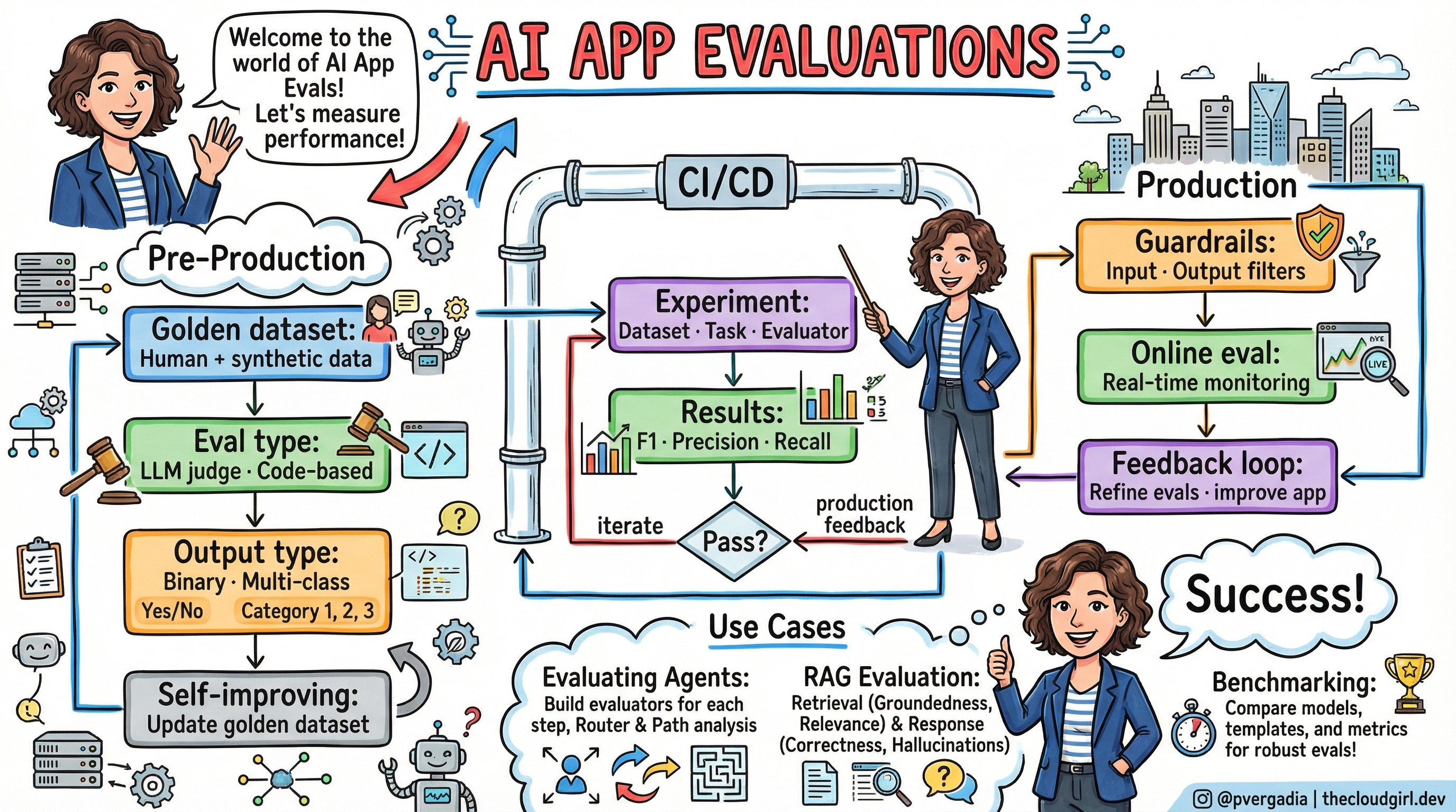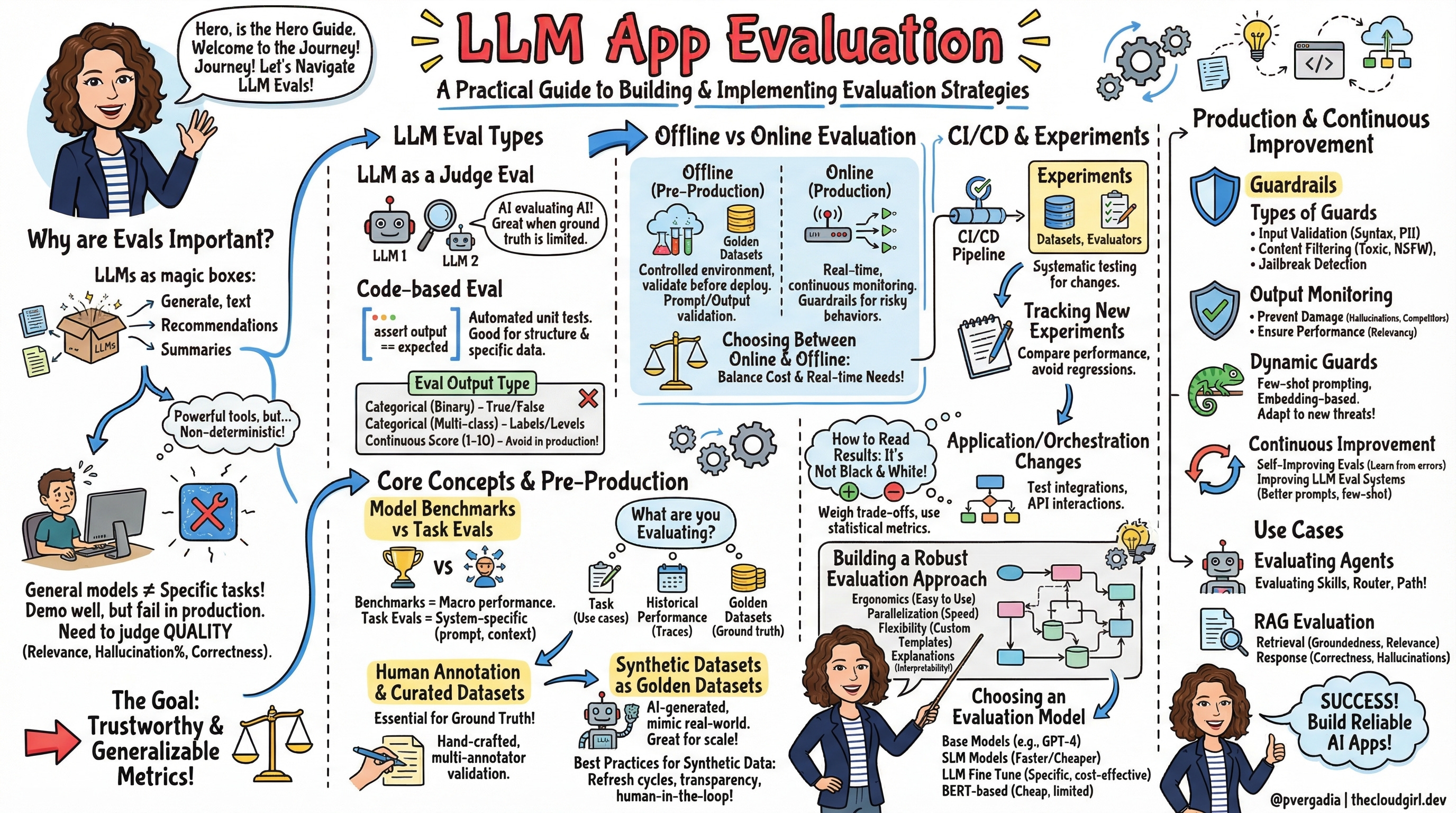 The overarching recommendation: start with offline evaluation and a small, high-quality golden dataset. Add code-based evals for any structurally verifiable output. Wire it to CI/CD. Deploy with guardrails for the most critical risk classes. Then let production data teach you which evals to refine next.