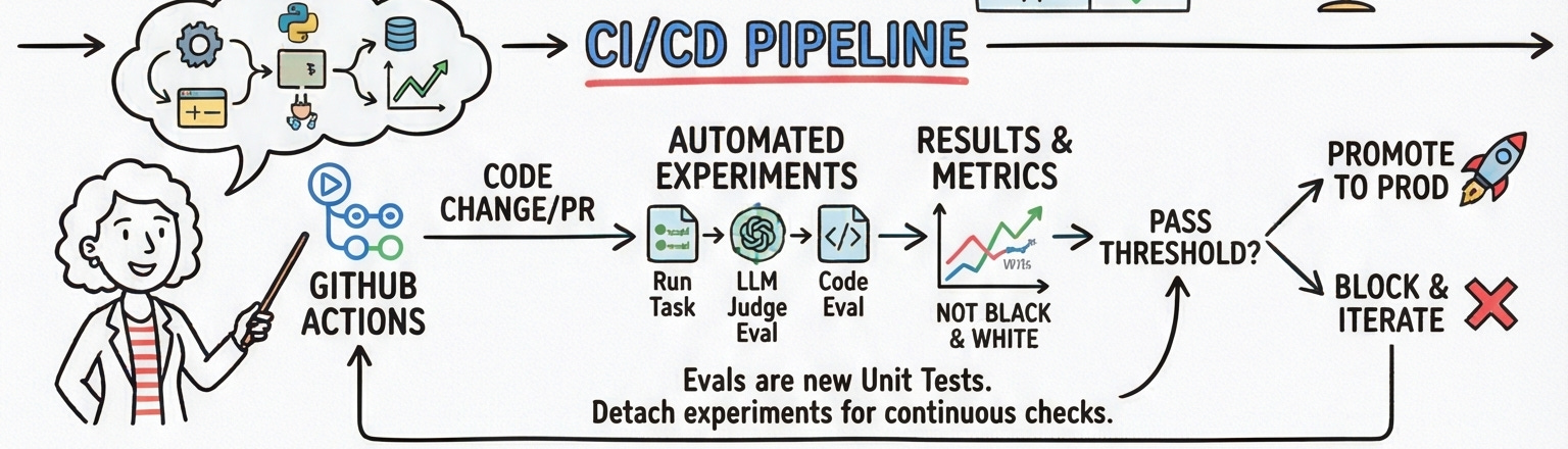 One detail that’s often missed: LLM applications are also affected by model updates and input drift in production, not just code changes. As a result, experiments need to be run regularly even when there aren’t associated pull requests. Detach your evals from CI/CD and run them on a schedule too.