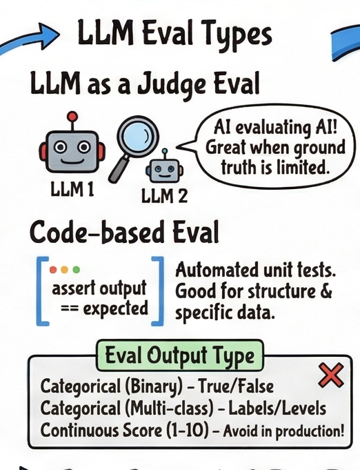 Code-based evaluation is preferred as a way to reduce costs, as it does not introduce token usage or latency. When evaluating a task such as code generation, a code-based eval is often the preferred method since it can be hard coded and follows a set of rules. Code-based evals shine for structural correctness does the output parse as valid JSON? Does the number fall within a valid range? Did the agent call the right function? These are cheap, fast, and deterministic. Run them first, run them often.